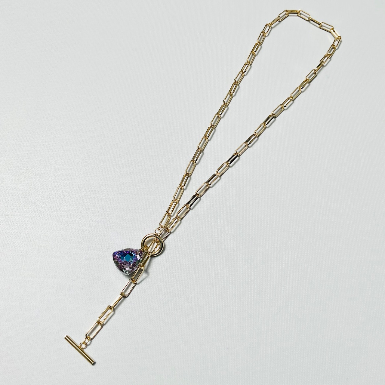 三角形のクリスタルガラスをデザインチェーンにセットしたラリエットネックレス。