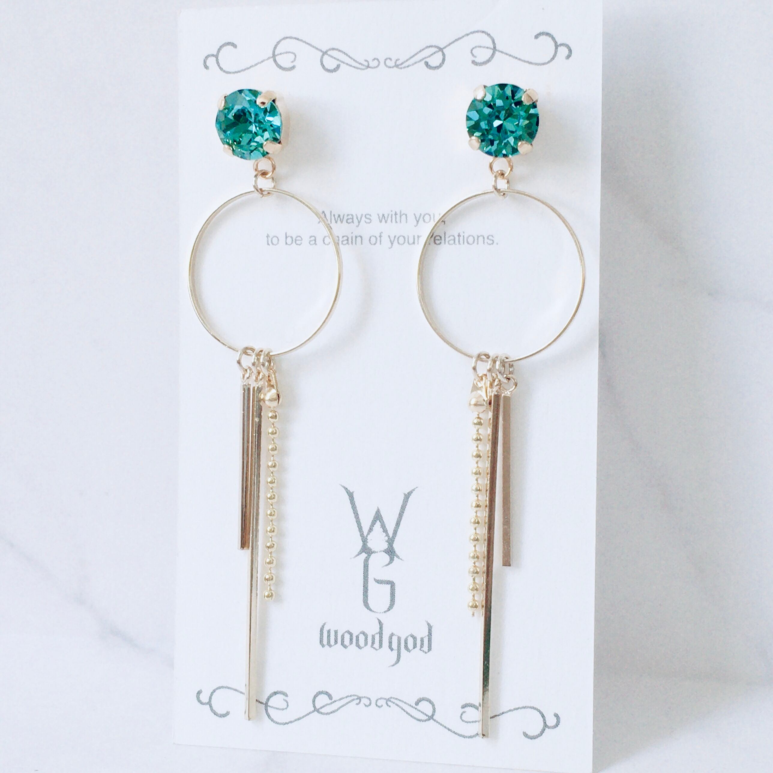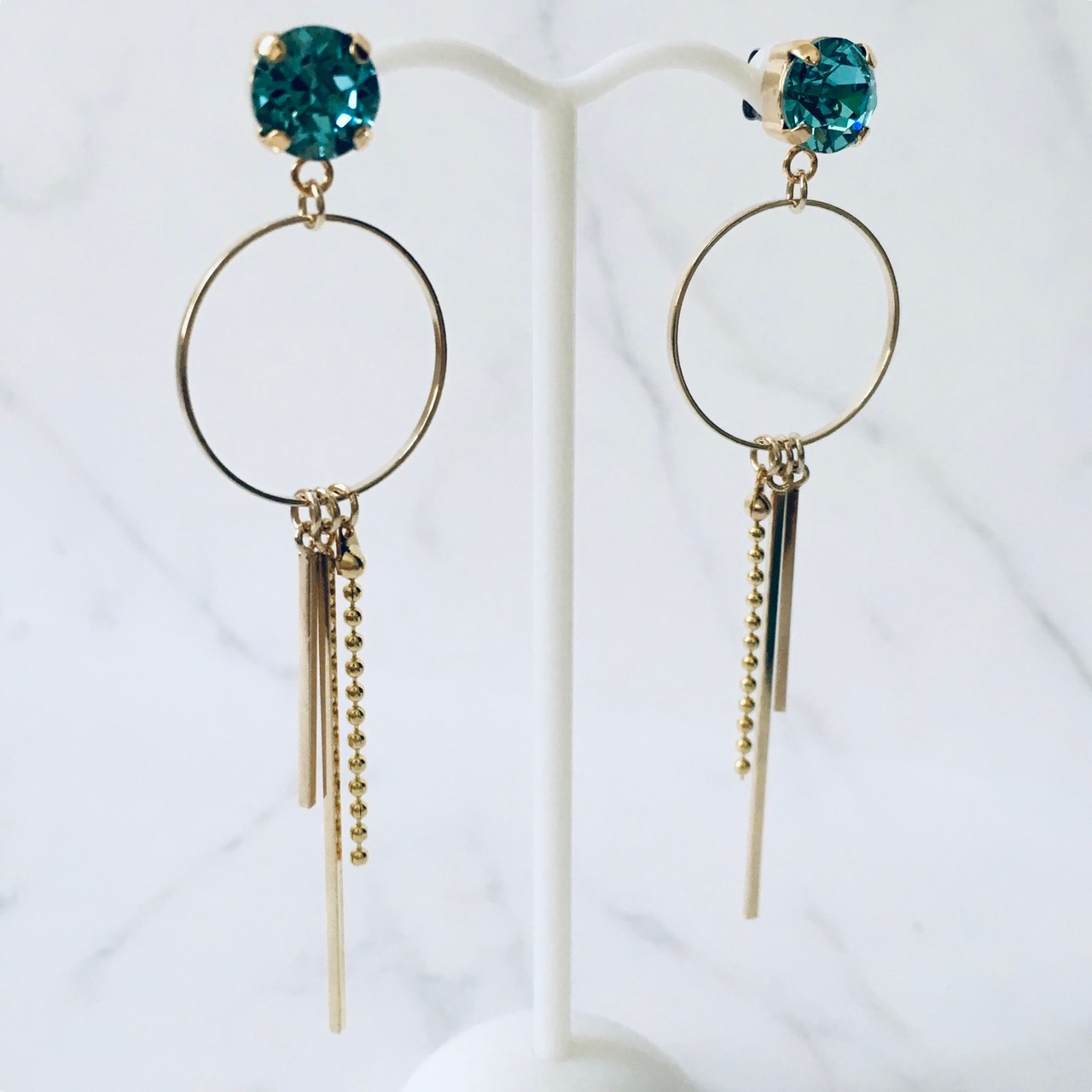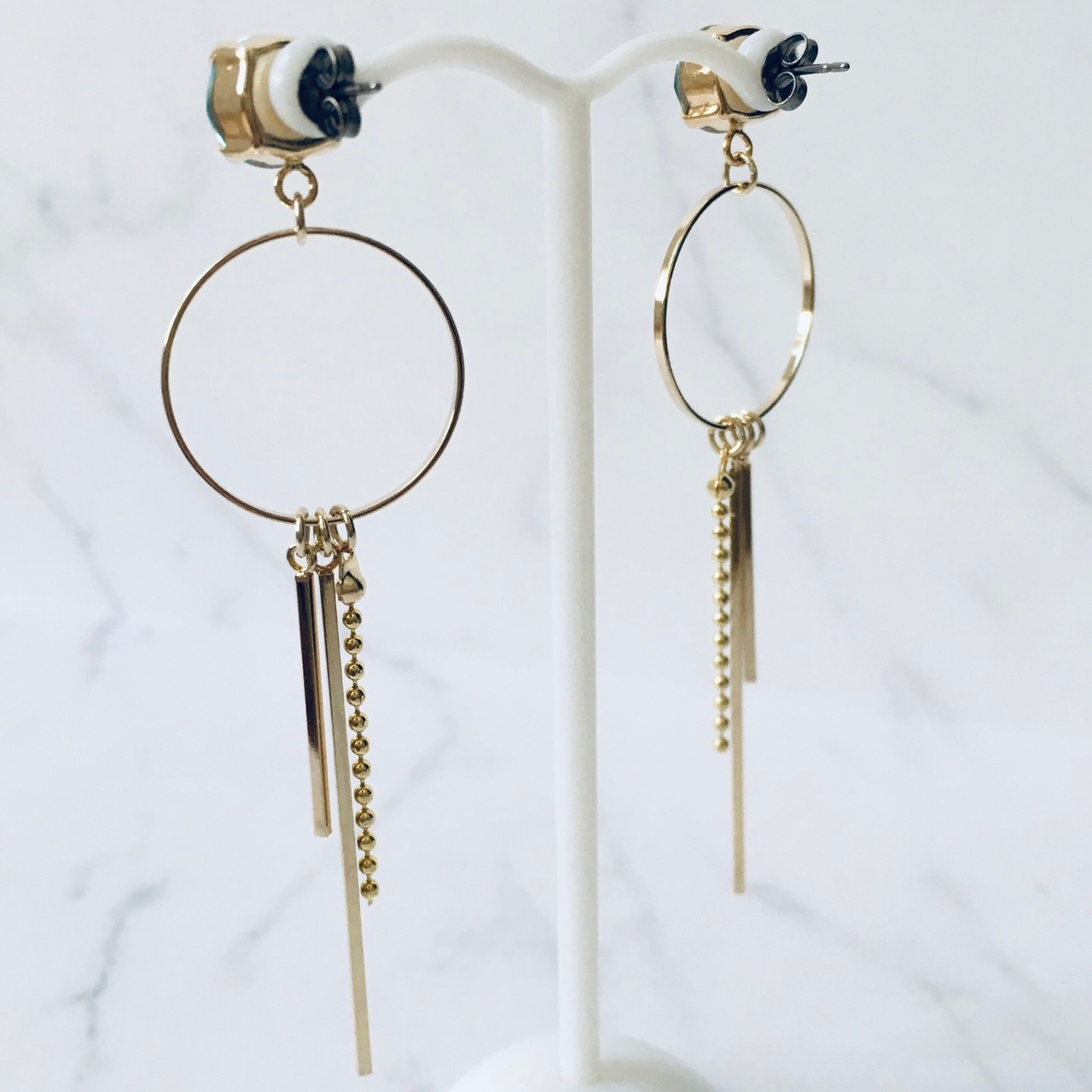 フープに長さの異なるメタルバーやボールチェーンをぶらさげたフリンジデザイン。